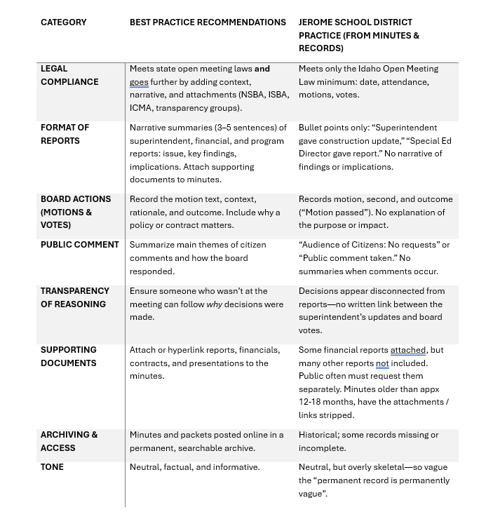 If Jerome wants to rebuild trust after the transportation crisis, one place to start is the minutes. The district should adopt best practices: narrative summaries of reports, clear explanations for motions, consistent reporting standards across departments, and full attachments posted online. Transparency is not served by bare legality; it is served by candor, clarity, and records that tell the truth of what happened in the boardroom.