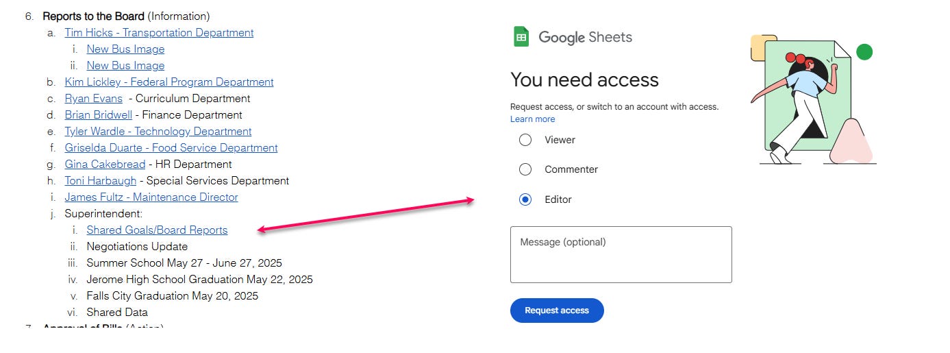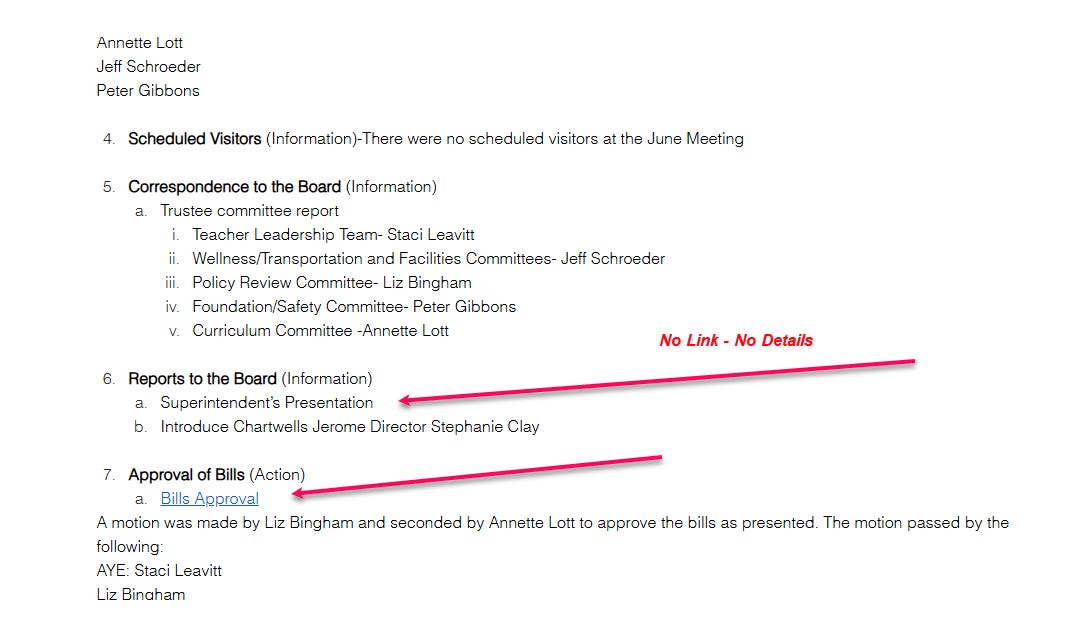 Jerome does link some attachments to its minutes, but even there the practice falls short. Some attachments are restricted from public access (Figure 1), others are nothing more than additional bullet points with no explanatory detail, and minutes older than 12 to 18 months often have the links and reports completely stripped out. In some recent minutes, reports are missing altogether. For example, the June 2025 Minutes - Superintendent’s Report (Figure 2) shows no attachment and provides no indication of what was presented, or whether anything was presented at all.